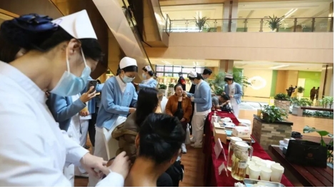 活动现场,中医外治中心、肿瘤科、脑病六科、康复科、临床营养科、药学部、制剂科等医务人员为大家免费提供特色疗法体验,养生粥、代茶饮、膏方免费品尝,中药饮片切片展示等活动,并为前来咨询的市民免费发放香囊。