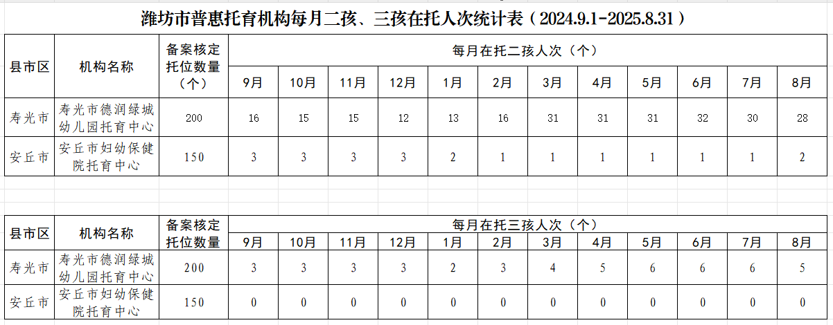 现将符合潍坊市普惠托育机构保育费补助的机构名单及每月二孩、三孩在托人次统计表公示如下: