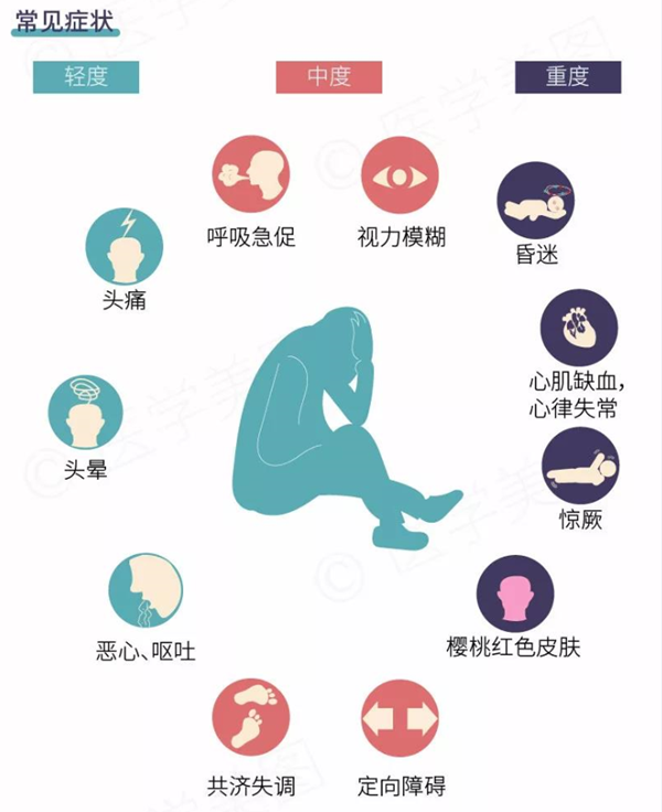 (三)重度中毒:深度昏迷,各种反射消失,大小便失禁,四肢厥冷,血压下降,呼吸急促,一般会很快死亡。即使抢救成功,也常留有痴呆、记忆力和理解力减退、肢体瘫痪等后遗症。