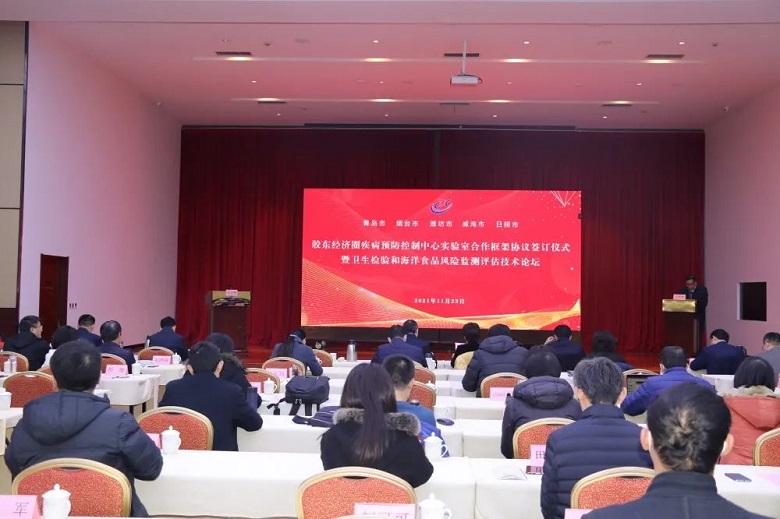 为深入贯彻胶东经济圈卫生健康一体化发展部署,11月23日,胶东经济圈疾病预防控制中心实验室合作协议签订仪式暨卫生检验和海洋食品风险监测评估技术论坛在青岛举行,青岛、烟台、潍坊、威海、日照五市疾控中心签署《胶东经济圈疾病预防控制中心实验室一体化发展合作框架协议》。山东省疾控中心副主任张天亮、青岛市卫生健康委党组副书记、副主任、市疾控中心党委书记张华出席仪式并致辞,青岛市疾控中心党委副书记、主任高汝钦主持签约仪式。