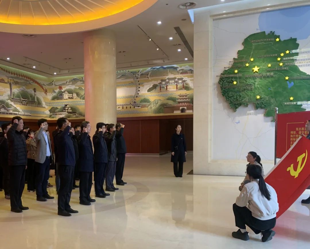 参观结束后,单杰带领全体党员干部面对党旗重温入党誓词,进行了庄严的宣誓。