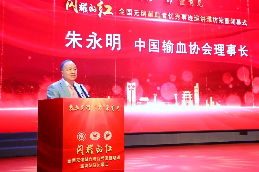 朱永明在讲话中回顾了“闪耀的红”巡讲活动的背景及成果,对参与无偿献血的个人和组织表示了感谢,并对无偿献血事业的未来提出了展望。