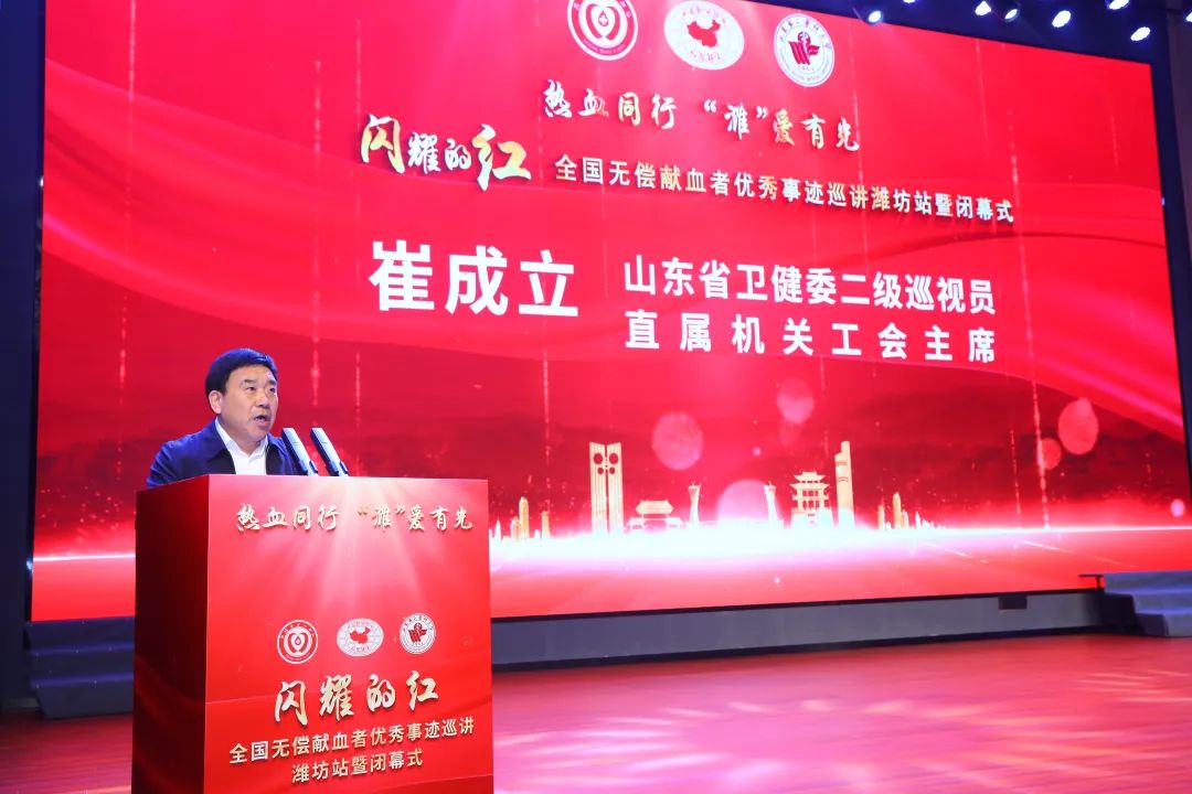崔成立在致辞中表达了对无偿献血事业的重视和支持。他强调了无偿献血在社会文明进步和健康中国战略中的重要性,并对山东省在无偿献血方面取得的成绩表示肯定。