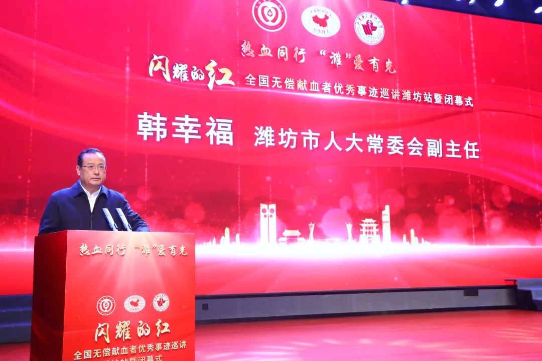 韩幸福在讲话中首先代表潍坊市委、市政府对活动的举办表示热烈祝贺,并对参与无偿献血事业的各界朋友表示崇高敬意。