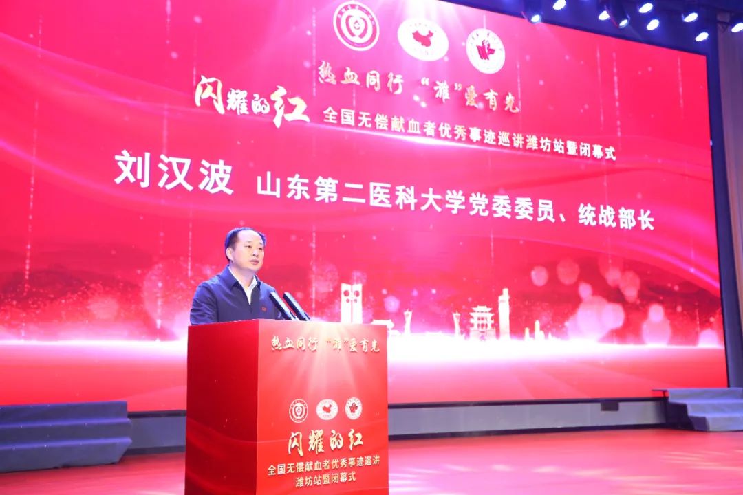 刘汉波在致辞中,首先代表山东第二医科大学向各位嘉宾的到来表示热烈的欢迎,向无偿献血者和志愿服务工作者致以崇高的敬意,向长期以来关心支持学校建设发展的朋友们表示诚挚的感谢。