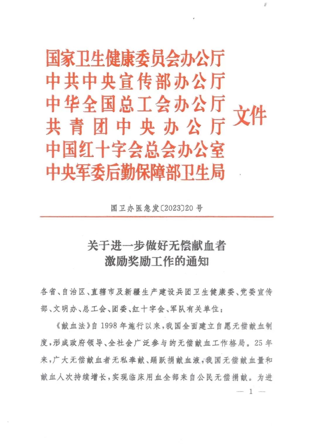 《献血法》自1998年施行以来,我国全面建立自愿无偿献血制度,形成政府领导、全社会广泛参与的无偿献血工作格局。25年来,广大无偿献血者无私奉献、踊跃捐献血液,我国无偿献血量和献血人次持续增长,实现临床用血全部来自公民无偿捐献。为进一步贯彻落实《献血法》,肯定和弘扬无偿献血者的奉献精神,鼓励更多社会公众关心、参与无偿献血,现就进一步做好无偿献血者激励奖励工作提出以下要求: